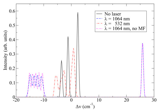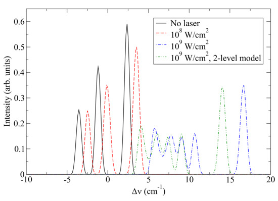 Finally, we investigate the influence on the transition pattern of the radiation of another widely used laser type, Nd:YAG, with the fundamental wavelength of 1064 nm. In this case, the and levels become nearly resonant with and their contributions, respectively, increase, while the – interaction loses its dominance. Compared to the 805-nm case, the effect is weaker, because the perturbation largely affects only one of the levels of the transition and the detuning is larger (also, the – oscillator strength is smaller). As a result, an order-of-magnitude stronger laser intensity is required to achieve a comparable effect—see Figure 3. For comparison, we also show results of a similar modeling but assuming the second-harmonic generation of the same laser. In this non-resonant case, the effect is significantly weaker, as one would expect. We again draw reader’s attention to the non-trivial signs of the transition shifts (and their change when switching the perturbation frequency) resulting from the complicated interplay of multiple terms in Equation (7).