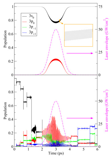 We assume the atom is initially in the metastable state. As seen in the upper panel of the figure, the laser pulse with a 1-ps Gaussian envelope gradually transfers the population to and then back to , while the states remain practically unpopulated (there is a tiny, population due to the magnetic component of the laser field). Note the high-frequency (about ) modulation of the graphs, shown in the inset, which is due to the non-resonant interaction term [corresponding to the second term in Equation (7)]. This minor feature is absent in the “rotating-wave” approximation (compare to Figure 1 in [23]).