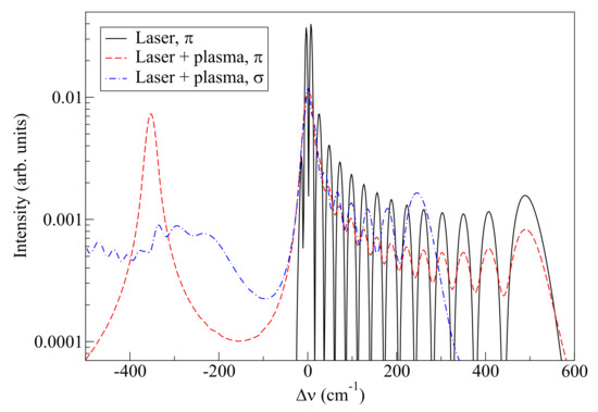 The spectra thus obtained are given in Figure 5. One immediately recognizes the so called Rabi sideband on the blue side of the unperturbed-line position, strictly -polarized when no plasma perturbation is assumed. When the latter is added, several phenomena are observed. First, the separate peaks in the Rabi sideband become broadened and less “contrast”. Second, a -polarized emission, having a qualitatively similar structure, but with differently placed minima and maxima, appears. Finally, a single strongly -polarized red-shifted peak emerges. We stress that the approach used to calculate spectra in Figure 5 is approximate in the treatment of the atomic density matrix. However, we believe that the qualitative features are correct. In particular, the plasma-caused smoothing of the Rabi sideband quasi-comb structures was observed experimentally—see Heck et al. [25] and references therein.