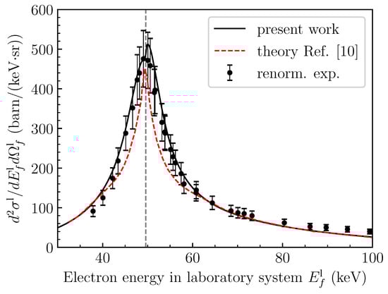 Let us start with presenting the results for the MeV/u U-N collision. Figure 1 shows the DDCS for ELC in the forward direction. The value of the maximal acceptance angle of the spectrometer was adopted in Equation (17). Due to unknown electron detection efficiency, the absolute cross sections were not derived from the data in Ref. [10]. Thus, the shown experimental data of Ref. [10] were renormalized on our results at keV. The obtained results well describe the experimental data, slightly underestimating them at high electron energies, and tend to overestimate at small energies. Also one can see that our results for emitted electron energies larger than 60 keV and smaller than 40 keV agree with the theoretical predictions of Ref. [10] obtained in the framework of the first-order perturbation theory as well. However, in the vicinity of the cusp, which is located at keV, the present results are considerably higher than those of Ref. [10]. The only difference between the two calculations is in screening potentials employed. The binding energies of the initial 2 s states calculated in these potential are very close to each other: keV and keV. Meanwhile, in the additional calculation with the same screening potential as in Ref. [10] we still see the difference in the emitted electron energy distribution in the laboratory frame. Moreover, we also compared the DDCS for ELC in the projectile frame (see Figure 2 of Ref. [10]) and found excellent agreement between the outcomes of two calculations. This could mean that the difference arises at the stage of the Lorentz transformation of the cross section to the laboratory frame and the following averaging over angles. Basically, both calculations describe the experimental data rather well, despite the omission of a possible atomic electron contribution to the electron loss process.