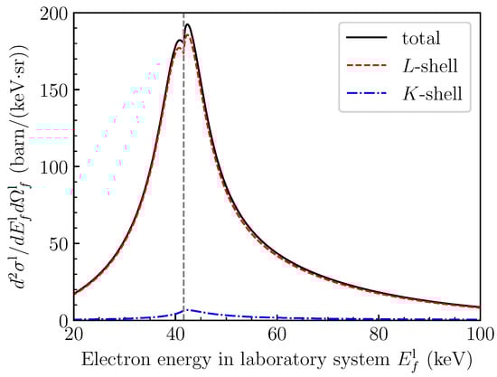 In Figure 3 the DDCS for ELC is presented for the value of along with the contributions from K- and L-shells.