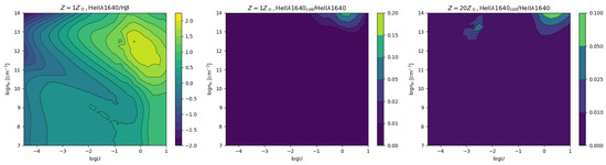 The code CLOUDY is designed to model environments that range from the low density limit to thermodynamic equilibrium [32,33]. CLOUDY models the ionization, chemical, and thermal state of gas exposed to a radiation field and predicts its emission spectra and physical parameters. In CLOUDY, collisional excitation and radiative processes typical of mildly ionized gases are included, at the expense of the radiation transfer, which is treated via a mean escape probability formalism. Maps are built on arrays of 667 simulations of the CLOUDY 13.05 and 17.02 photoionization models for a given metallicity Z and , with n and U evaluated at steps of 0.25 dex covering the ranges cm−3, . They were repeated for 12 values of the metallicity, in the range 0.01 –100 . Three values of were considered and 23 cm−2. The macro trends described in the isophotal contours representing (U, ) slices of the parameter space and presented in Section 4 were validated by the use of both CLOUDY 13.05 and 17.02.