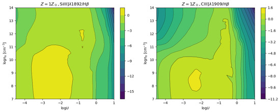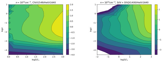 where the sum is done for for the doublets. Only is considered for Heii1640, Ciii], and Siiii]. The ratio is shown as a function of and U, for two metallicity cases, 1 and 20 for the various doublets, for Heii1640, and for the semi-forbidden lines in Figure 1, Figure 2 and Figure 3. Figure 1 shows that collisional excitation is by far the dominant mechanism for the formation of the Civ doublet over a very broad range of ionization parameters and density, with becoming significantly less than one for and . Considering, for example, a very low ionization case () = (−4.0, 12), the dominant ionization stages of carbon change from triply to singly ionized. At such low U, the Civ line is extremely weak, and its emission is sustained by collisional excitation only close to the illuminated face of the cloud. At , the dominant emission mechanism is provided by continuum pumping.