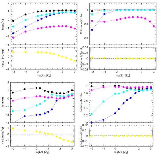 Figure 5 shows the behavior as a function of for the ratio for a typical low ionization (−2.5, 12) and high ionization case (0, 9), meant to be representative of the virialized, low ionization and of the high ionization outflow sub-regions revealed by the emission line profiles. Above solar metallicity, collisional excitation accounts for most () or all line emission save in the case of Nv at low ionization. In the high ionization case, Aliii shows values that are less than 0.5 up to . In this domain, however, the Aliii line is very weak. Since is related to the line intensity, in the sense that differs significantly from one only if the line is weak with respect to H, Figure 5 implies a dependence on Z of the Aliii/H and Nv/H intensity ratio in the high ionization case. Intensity ratios involving Aliii and Nv have been indeed used as Z diagnostics for quasars [34,35,36].
