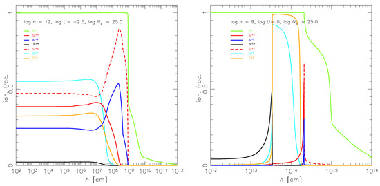 The Civ and Aliii intensities relative to H and the ratio as a function of column density are reported in Table 1, assuming . In the high ionization case (0, 9), Civ remains strong at all values, and the contribution of collisional excitation increases steadily with . The Aliii doublet is predicted to be always faint in this case. In the low ionization case (−2.5, 12), a significant decrease in the collisional excitation is seen only for log (cm−2). Values of much higher than log (cm−2) are likely for the low ionization part of the broad line region [8,9], but it is expected that both Civ and Aliii will remain strong, with close to unity.