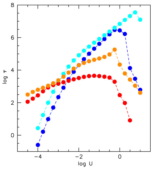 Line optical depth of Civ (blue and cyan) and Aliii (red and orange) as a function of the ionization parameter U, for (blue and red) and 20 (cyan and orange), assuming log = 9 cm−3.