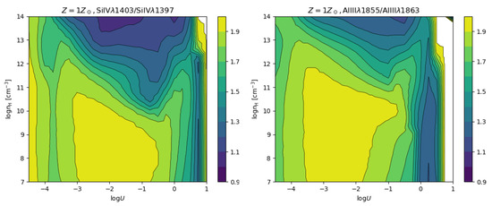 The issue of the intensity ratios of the doublet components is relevant to the spectral analysis of high-z quasars or low-z type-1 AGNs observed from spaceborne observatories [51]. As the lines originate from the transition between the same spectroscopic terms, we would expect that, in the case of optically thin line emission, the ratio is equal to the ratio of the statistical weight of each level, i.e., , implying a maximum ratio of two for the ratio between the and the components of the doublet, I()/I(). The UV emission lines emitted in conditions of moderate to high density and high are never fully optically thin. At large optical depths, collisional excitation dominates, and the doublet becomes thermalized: the lines of the doublet should be of equal intensity. This second condition is also not fully realistic: we cannot receive photons from a region of . As a matter of fact, the ratio between the Aliii lines I()/I() is found to be ≈1.25 [52]. This corresponds to very high densities in the CLOUDY simulation (Figure 9), supported by several lines of evidence for the low ionization part of the BLR [7,53,54]. According to the photoionization simulations, a value of ≈1.3 could be appropriate for both Aliii and Siiv.