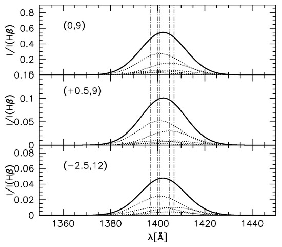 We consider three different cases in terms of the ionization parameter. The first case (top panel of Figure 10) corresponds to the high ionization solution derived for the emission expected from quasar BLR outflows; the second case (middle panel of Figure 10) represents a higher ionization case; the third case is the low ionization, high density case with the parameters expected for the virialized, low ionization part of the BLR. The first case is the one where Oiv]1402 emission is most efficient. The third case, because of the much higher than the critical density of the Oiv]1402 transitions, implies very weak Oiv]1402 emission (∼0.05 the intensity of H). The point here is that, even if the relative intensity of the components is affected by the different physical conditions, the profile of their sum remains stable: the peak of emission occurs at 1402.25 ± 0.10 Å and the FWHM at ≈4720 km s−1 without any significant difference for the three cases. The 1401 line, with a relatively high spontaneous transition probability for an intercombination line ( s−1) and a large statistical weight within the multiplet, remains the dominant contributor to the multiplet.