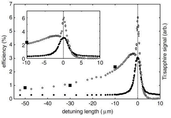 FEL efficiencies (open circles) and Ti:sapphire signals (solid circles) as a function of detuning length at the JAERI-FEL experiment. The enlargement around is also shown. The symbols without error bars have an error less than their size. The absolute vertical scale was calibrated by an average energy loss of the electron beam over an entire macropulse (solid squares) at several detuning lengths [].