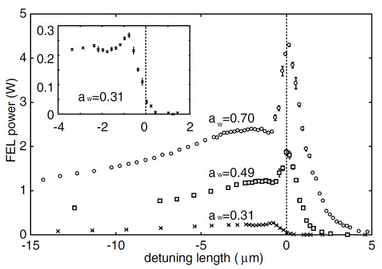 FEL power measured as a function of detuning length with different undulator parameters at the JAERI-FEL experiment: (open circles), (open squares), and (crosses). The macropulse duration is 0.4 ms at a 10 Hz repetition rate. The enlargement around for is also shown in the inset [].