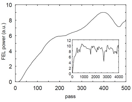 Figure 3 and Figure 4 show results of the simulation to reproduce the JAERI-FEL lasing at the zero detuning length []. The FEL pulse shows linear evolution rather than exponential growth. The temporal shape of micropulses in Figure 4, an exponential lobe of the leading edge and the main peak followed by ringing, is identical to Burnham–Chiao ringing of superradiance from atomic systems [] and consistent with the pulse shape at the weak superradiance in the high-gain FEL amplifier [,] and the numerical result for superradiance in a short-pulse FEL oscillator [].