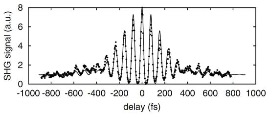 Few-cycle pulse generation at the lasing was experimentally confirmed at the JAERI-FEL []. Figure 5 shows the result of autocorrelation measurement with fringe-resolved second-harmonic-generation (SHG) signals from a tellurium crystal at the JAERI-FEL. The FEL pulse duration was evaluated as 3.4 optical cycles (FWHM) without taking frequency chirp into account. Numerical simulations with the JAERI-FEL parameters reproduced the experimental result of the pulse duration and suggested that the pulse could be as short as 1.5 cycles after chirp compensation.