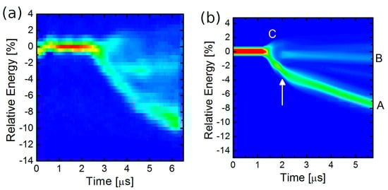 We can see that the energy evolution maps obtained from the experiment and the simulation have a common structure of three branches. The first branch is the component for continuously decreasing energy (A in Figure 6b), which corresponds to electrons trapped in the bucket to be efficiently decelerated. Figure 6 shows that a large part of electrons belong to the first branch. This is the reason a high extraction efficiency was realized in the experiment. The second branch is the component with constant energy (B in Figure 6b), which shows the existence of electrons untrapped in the bucket, but the amount is not very large. The third branch is the component whose energy is slightly increased and soon disappears (C in Figure 6b). The third branch indicates that a small fraction of the electron beam is slightly accelerated in the early stage of the energy extraction.