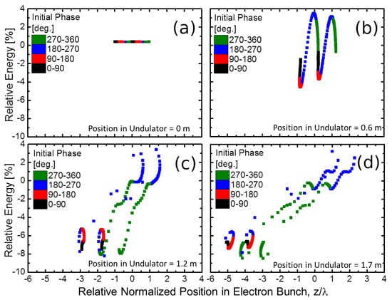 Simulation results for KU-FEL. Evolution of the energy of electrons with different initial phases in the undulator at the end of the macropulse is plotted: (a–d) phase space plots of the two-wavelength slices of the electron beam at the center of the electron bunch and at the different longitudinal positions in undulator. The longitudinal position in the undulator for (a–d) are 0, 0.6, 1.2, and 1.7 m, respectively. The horizontal axis is relative position in the electron bunch normalized by the lasing wavelength m [].
