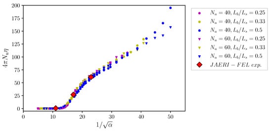 The simulations were carried out by a one-dimensional time-dependent FEL code same as our previous study []. We chose the number of undulator periods at , and the bunch length normalized to the slippage length at , and varied the normalized cavity loss, , in the range of . Figure 8 plots the simulation results of the normalized FEL efficiency at the perfectly synchronized cavity length, , as a function of , the inverse square root of the normalized cavity loss. In the simulations, a rectangular-shaped bunch was assumed and the shot noise was introduced according to the standard algorithm []. The results of the JAERI experiment are also plotted.