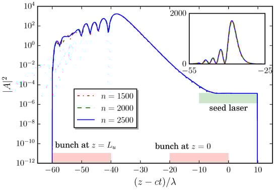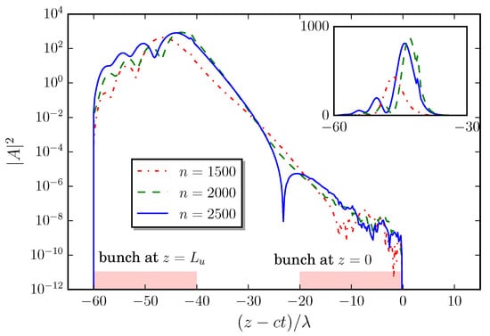 - Yang, X.; Mirian, N.; Giannessi, L. Postsaturation dynamics and superluminal propagation of a superradiant spike in a free-electron laser amplifier. Phys. Rev. Accel. Beams 2020, 23, 010703. [Google Scholar] [CrossRef]