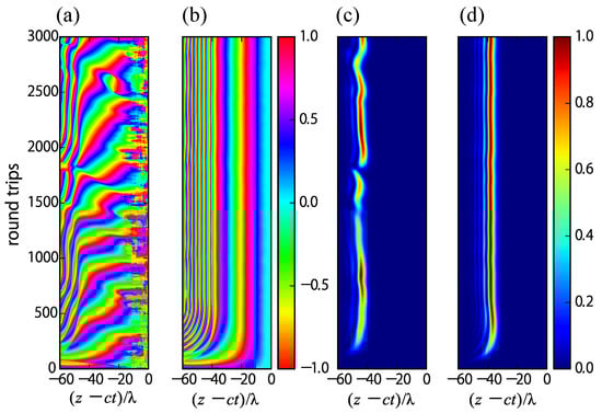 Contour plots of instantaneous phase of simulated FEL pulses in units of rad for: (a) without injection seeding; and (b) with injection seeding. Contour plots of instantaneous intensity of FEL pulses normalized to the maximum intensity for: (c) without injection seeding; and (d) with injection seeding [].