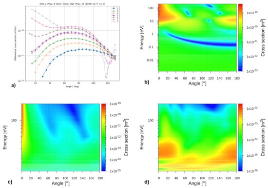 Here the adjective “total” and subscript “T” are added to indicate explicitly that this cross-section is a measure of the probability that a collision occurs regardless of its scattering angle. Differential scattering cross-sections are generally not well known. Therefore, kinetic LTP models usually resort to the assumption of simple angular scattering distributions [23,24]. In the case of electrons, elastic collisions are modeled as an isotropic scattering process via the momentum-transfer cross-section