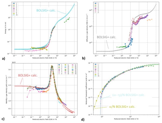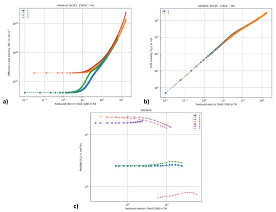 where the main transport coefficients are the drift velocity and the diffusion coefficient D. The drift velocity is proportional to the electric field, , with a coefficient of proportionality called mobility and ± the sign of the particle charge. These transport coefficients can be measured in swarm experiments (as functions of ), hence they are known as “swarm parameters”. They can also be calculated from an appropriate set of cross-sections by solving the Boltzmann equation for a simple particle swarm system with a uniform electric field and no boundaries, or, alternatively, by Monte Carlo simulation of such a system [7,26].