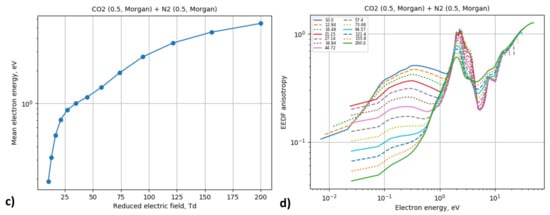 This can be used to parameterize all the above electron transport coefficients and rate coefficients (in look-up tables) as functions of mean energy, disregarding the corresponding values, so that they can be compared with their “Maxwellian” counterparts. Fluid or global models [30,31,32,33] based on this approach contain a fluid energy equation to describe the evolution of the mean energy without assuming it directly related to , similar to the thermal fluid models based on a Maxwellian distribution function. This is known as the “local mean energy approximation”, in contrast to the “local field approximation” where the transport coefficients and rate coefficients are explicitly dependent on .