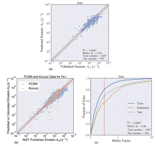 Figure 3b shows such a comparison between the full dataset (training, validation, and testing) of neural network predictions for neutral iron and the Kurucz neutral iron atomic dataset. The transition probabilities predicted by the neural network relative to the NIST published values are plotted in comparison to the Kurucz calculated transition probabilities relative to the NIST published values. The Kurucz and NIST datasets share some sources for their values and, therefore, have nearly perfect agreement for a subset of transition probabilities. The spread of neural network predictions is seen to be grouped well around the Kurucz dataset. Quantitatively, 69% of the predicted testing values lie within a factor of three of the NIST values while 94% lie within a factor of three for the Kurucz dataset. The fraction of predictions within this 3x space is explicitly shown in Figure 3c for the iron neural network dataset. The chart shows the fraction of predicted values within a factor of the actual published value for the training, validation, and testing data subsets for iron. A factor of one represents a perfect prediction. The vertical dashed line indicates the factor of three represented by the shaded region in Figure 3a,b as a reference. The R 2 metric and within-3x score are applied to each independent elemental model as a method for performance comparisons.