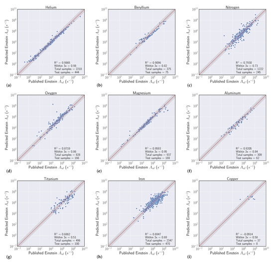 The data in Table 3 indicate that the interelement model does enable improved prediction performance in the majority of cases. When comparing the R 2 values for predicted vs published regressions, intraelement models that already had reasonably good performance did not significantly benefit from training on additional transitions from other elements. In some cases, the performance of these models is slightly decreased, as is the case for beryllium, helium, and aluminum. However, for intraelement models that perform poorly such as copper, titanium, and iron, the interelement model significantly improved prediction performance.