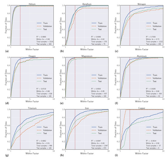 The training, validation, and testing performance is more quantitatively assessed in Figure 5 which displays the fraction of predicted transition probability values within a factor of the published value for the same nine intraelement models. A factor of one indicates that fraction of data are perfectly predicted while the vertical dashed line in the individual plots, again, indicates the factor of three threshold for which the broader metric is calculated. The best performing models, such as helium and magnesium, all have a high fraction of predicted values below the 3x threshold. In addition, the performance of the training, validation, and test sets for these models do not readily deviate from one another. The intraelement models with lower performance tend to have training sets that perform well but show lower performance on the testing set. The full set of tabulated performance metrics and performance plots for each element can be found in Appendix A.