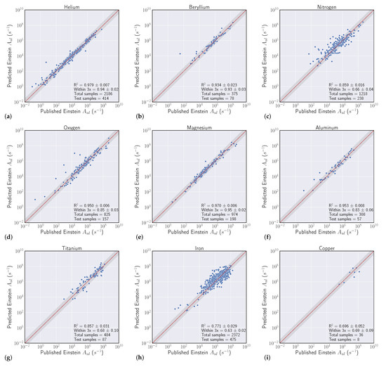 Nine intraelement models from across the periodic table are sampled to provide a more comprehensive view of the actual vs. predicted performance metric of FCNN intraelement models. Shown in Figure 4 are plots of the predicted Einstein A-coefficients against the Einstein A-coefficients published in the NIST ASD for these nine elements. It is evident from Figure 4 that elements such as helium and iron contain more samples for training and testing than elements such as beryllium and titanium. This is merely a function of the number of available tabulated transition probabilities for these elements in the NIST ASD. However, elements that contain many tabulated transitions across a wide dynamic range of transition probability magnitudes, such as helium and magnesium, tend to generate models that predict probabilities more accurately. Some models such as iron have many available transitions in the training set but many of the values only span a limited range of transition probability values. The limited dynamic range of transition probabilities that these models have available for training tends to lead to predictions that have more spread in their prediction distributions. This effect is observed in the relatively lower performing model outputs for iron, nitrogen, and titanium.