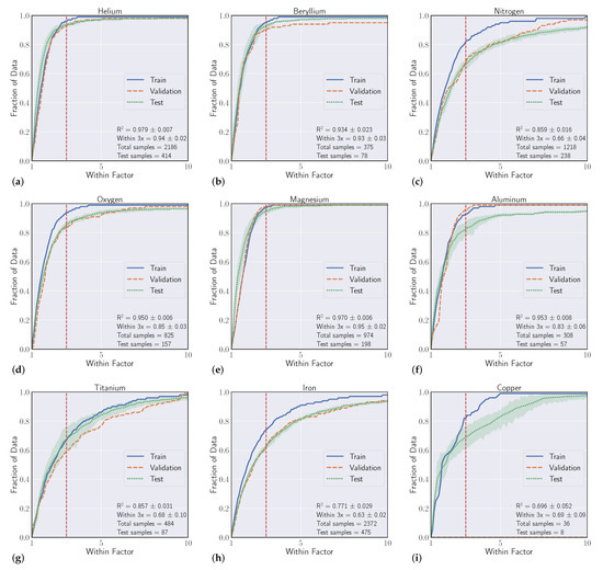 Subsequent to assessing performance of the intraelement models, the next obvious approach is to determine if training a FCNN model on multiple elements rather than a single element improves prediction performance. In this method, an interelement model is trained using the transitions from across the nine elements previously discussed in Section 4.1. The dataset is constructed such that it encompasses the largest common subset of features between the nine elements (see Section 3). Upon testing, the interelement model is tested on a single element to assess its performance relative to the intraelement model. The prediction performance of the interelement model for the R 2 and fraction of predictions within 3x are plotted in Figure 6 and Figure 7 and the metrics are quantitatively summarized in Table 3. A 95% confidence interval band is shown for the top 5 models found during hyperparameter search over the test set in Figure 7. Similarly, sample mean and standard deviation of R 2 and W 3 X for the top 5 models is given in Table 3.