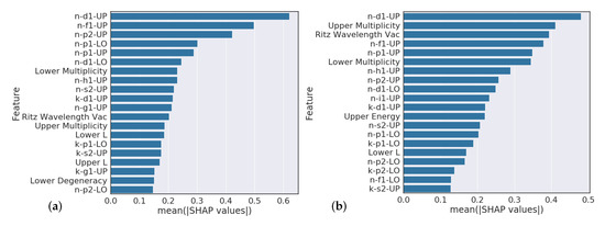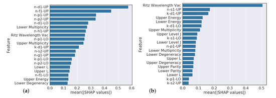 Figure 8. SHAP feature importance results. (a) high performing models (helium, aluminum, magnesium, nitrogen, and oxygen); (b) low performing models (molybdenum, titanium, vanadium, iron, and chromium). The configuration parameter labels are in the format {n,k}-L#-{UP,LO}, where n and k denote if the feature is principle quantum number (n) or occupation number (k), L is the orbital angular momentum with the indexed (#) occurrence in the total configuration, and UP/LO associates it with the upper or lower energy level in a transition.