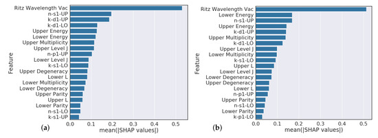 Earlier in Section 2, it was assumed that feature representation of spectroscopic transitions would be intimately aligned with nuclear and electronic structural configurations as these are the fundamental parameters informing theoretical calculations. The configuration describes the wavefunction, which subsequently provides the overlap integral for the transition probability. Energy states with a defined configuration provide an opportunity to inform the model during training about the orbital distribution of the electrons in the upper and lower energy states for a given transition. Our analysis suggests the configuration features are indeed some of the most important features to high performing models.