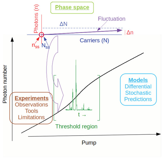Graphical representation of the topics addressed in the manuscript. Nss and nss refer to the steady-state operation values of the population inversion and photon number, respectively, around which a fluctuations operates, for a given set of parameters.