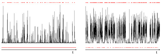 Schematic illustration of the evolution of the time intervals (red islands) in which the photon number exceeds a predetermined threshold for two different values of pump, computed from a Stochastic Laser Simulator [83] for . The black lines represent the photon number. The pump in the two panels differs by about 2%. The relative time intervals are and for the left and right panels, respectively. . Graphical resolution makes it almost impossible to detect the “holes” in the lower red set (left panel) which match the appearance of the red upper regions—they are, nonetheless, present. Data courtesy of G.P. Puccioni.
