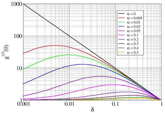 Zero-delay second-order autocorrelation, Equation (4), in double logarithmic scale, as a function of the duty cycle , and for different values of the baseline’s amplitude (fraction of the peak amplitude A).