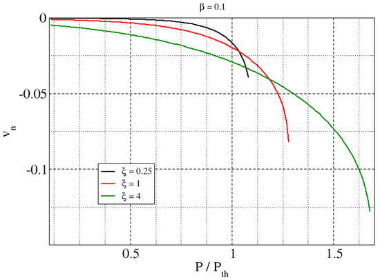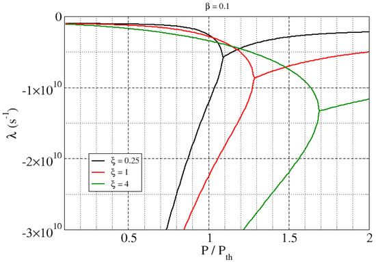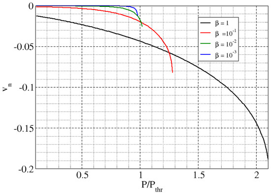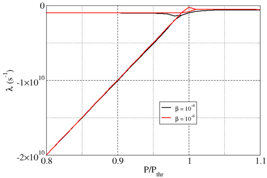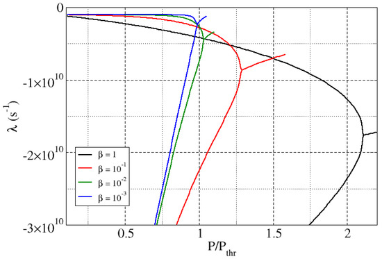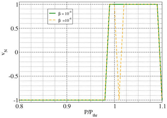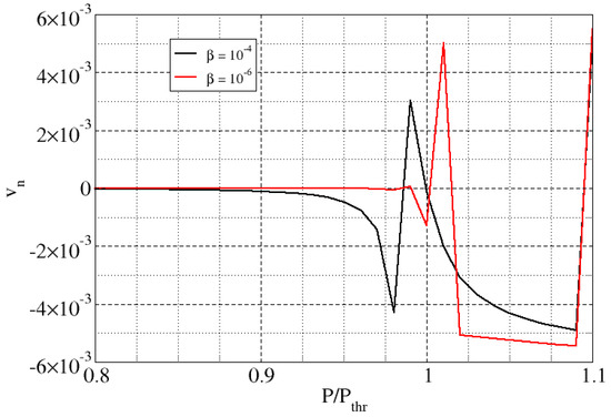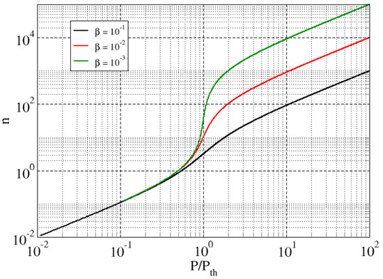 - The addition of spontaneous emission, for instance as a constant contribution (cf. Equation (7)), breaks the transcritical bifurcation [97,98,99] which characterizes the standard REs written for macroscopic lasers [50,96]. This is a consequence of the finite cavity volume (expressed by the fraction of spontaneous emission coupled into the lasing mode, ) and is related to the disappearance of the thermodynamic limit, recovered when (cf. [67] for details). Its immediate, and partly counterintuitive, consequence is a progressive stabilization of the laser operation as increases (cf. Section 6): nanodevices are more stable than their macroscopic counterparts. For an interesting physical application of imperfect bifurcations, cf. [100].