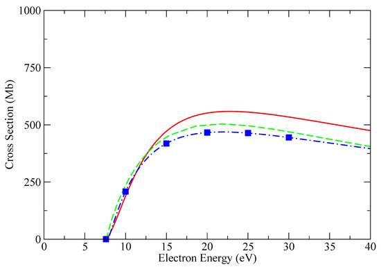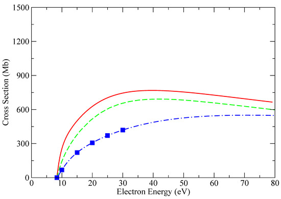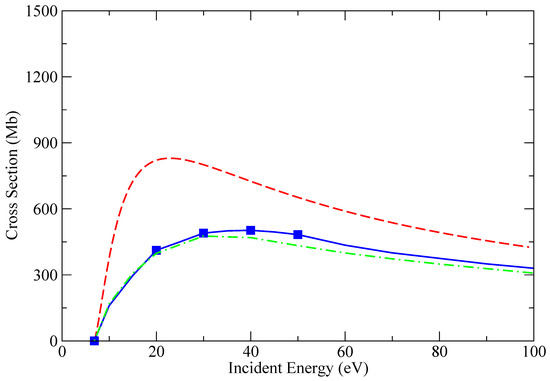 Electron-impact direct ionization of the subshell of Pb. Dashed line (red): distorted-wave method with a polarization potential, solid line with squares (blue): time-dependent close-coupling method with a polarization potential, dot–dash line (green): convergent close-coupling method [9] with a polarization potential (1.0 Mb = 1.0 × 10 cm).