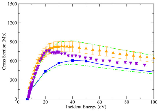 Electron-impact ionization of Pb. Solid line with squares (blue): total TDCC direct ionization cross section with a polarization potential, dot–dash line (green): total CCC direct ionization cross section [9] with a polarization potential, dot–dash–dash line (green): total CCC direct ionization cross section with a polarization potential plus R-matrix B-spline indirect ionization cross section [9], up triangles (orange): crossed-beams measurements [10]. down triangles (violet): crossed-beams measurements [11] (1.0 Mb = 1.0 × 10 cm).