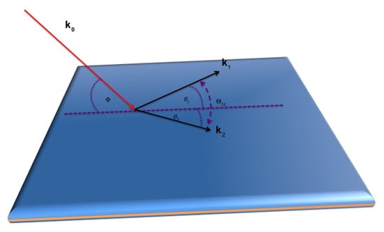 There are experiments in the perpendicular plane [,], i.e., . These experiments were analyzed in [,] with a simple multiple scattering argument to explain the general behavior of the cross section and obtained very good agreement with the experiment using a DWBA approach. Within the DWBA, there are only two paths to the perpendicular plane:
