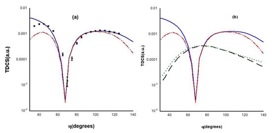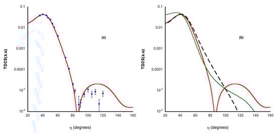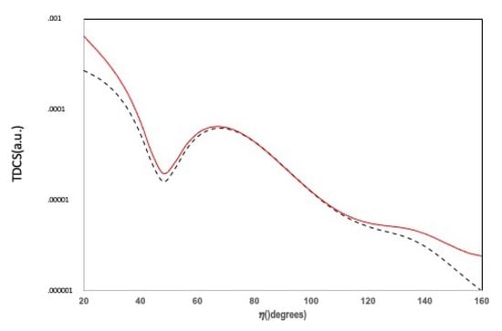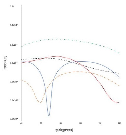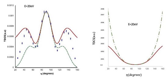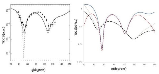 In the electron experiments of [] on helium, the angle was varied and a deep minimum in the TDCS observed for (see Figure 5). In [,], DWBA calculations were presented, and the deep minimum reproduced. In the same paper, it was shown that the minimum existed even in the simplest calculation of this type where neither polarization nor post collisional electron–electron interaction was included. Rasch et al. explored the possibility of such distinct interference effects being observed in other targets, and they found that such a structure would be observed in other closed shell atoms but only for s states. They predicted such that it would be evident in at an impact energy of eV for . This predication was subsequently confirmed []; see Figure 6. In addition, shown in this figure is the DWBA with and the deep minimum is still visible, but, as would be expected, the cross section is reduced for smaller values of . The equivalent positron impact calculation is also shown. The deep minimum has been replaced by a shallower and wider one, and the minimum value shifted towards smaller values. The inclusion of enhances the cross section for smaller values.