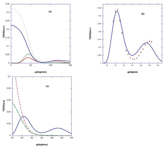 TDCS for the ionization of helium in coplanar symmetric geometry (i.e., ) for eV. (a) Various theoretical curves for electron impact, dotted black: DWBA (singlet exchange potential); solid blue: DWBA (singlet exchange potential) with polarization but no pci, green dashed line with crosses: DWBA (singlet exchange potential) with pci but no polarization; red solid line, DWBA with polarization and pci; (b) Electron impact; experiment [], theory DWBA (singlet exchange potential) with polarization and pci; (c) Solid blue curve DWBA (singlet exchange potential) for electron impact with polarization and pci, dashed red curve DWBA for positron impact with polarization and pci, green dashed-double dotted DWBA for positron impact with polarization but no pci.