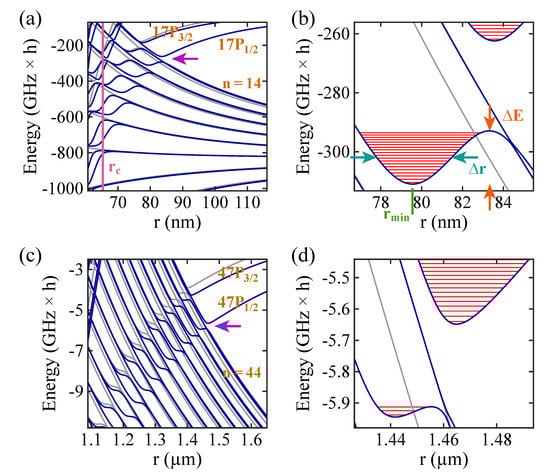 For the sake of a concrete example, we choose Rb as the neutral atom species. Figure 1 shows Rydberg levels of a Rb atom as a function of the internuclear distance r between atom and ion. Specifically, the level structures in the vicinity of states are considered. The principal quantum number is for Figure 1a,b, while it is for Figure 1c,d. In the given range of energies and internuclear distances, avoided level crossings between the high-field-seeking () states and the low-field-seeking states of the hydrogenic manifold belonging to () start to occur. Here, J denotes the total electronic angular momentum quantum number, which can be or for the P states. The avoided crossings give rise to potential wells within which molecular bound states can exist. Figure 1b,d are magnifications of the regions marked with magenta arrows in Figure 1a,c. The horizontal red lines in Figure 1b (Figure 1d) are the quantum-mechanical vibrational bound state levels in the wells (for rotational angular momentum ).