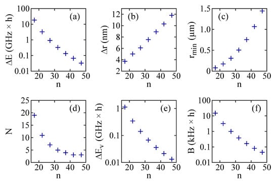 Bound state wells, similar to the ones discussed in Figure 1, also occur for different principal quantum numbers n. In fact, there exists a Rydberg series of potential wells for the long-range atom–ion Rydberg molecules. The well depth , the width at half the depth, and the position of the bottom of a well (see Figure 1b) change with n. Figure 2 shows these dependencies for the second outermost potential well associated with the state, as n increases in steps of five units from to . As can be seen in Figure 2a, decreases by about three orders of magnitude from for to about for . At the same time, increases from about to almost (Figure 2b), and the binding length rises from to a remarkable value of (Figure 2c).