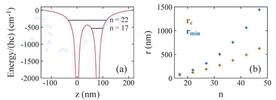 Finally, we discuss the stability of long-range atom–ion Rydberg molecules in terms of over-barrier motion [35]. In Figure 3a, the red solid lines show the total Coulomb potential of the Rydberg electron and the two ionic cores