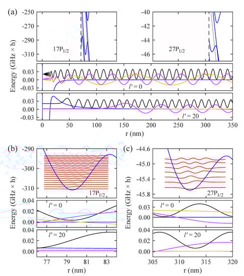 Comparison of wave functions. (a) Upper panel: Potential energy curves in the region of the two outermost potential wells associated with the (on the left; see also Figure 1b) and the (on the right) states. Blue (gray) solid lines indicate levels with (). Black dashed vertical lines mark internuclear distances below which the potential energy landscape is not plotted. The energy reference is the term energy of the and state, respectively, at zero electric field (). Middle panel: The blue solid lines show the potential energy curve for a Rb atom colliding with a Ba ion within the partial wave . We choose the state to represent the short-range part for (see text). Here, the energy reference corresponds to the atomic asymptote of the two collision partners. The black, magenta, and ocher solid lines are scattering wave functions for atom–ion collision energies E of , respectively. Their amplitudes are scaled for better visibility and are given in arbitrary units. Lower panel: The same as the middle panel but for . For the blue solid lines, the angular momentum potential is included. (b,c) Magnifications of parts of Figure 4a. For simplicity, in the upper panels, only the second outermost potential wells associated with the states and are considered. The red solid lines are the wave functions of vibrational levels with (presented by using a scaling factor and given in arbitrary units).