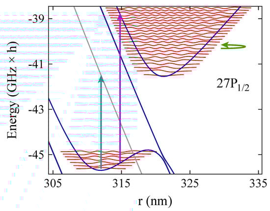 Even for energies slightly below the potential barrier charge exchange might occur due to tunneling of the electron through the barrier. This would lead again to a breakdown of our scheme. Therefore, we have calculated tunneling probabilities similarly as in Equation (9). For and an approximate binding length of , and using the unperturbed level energy of the Rydberg atom, we obtain a tunneling probability of about . The frequency of the oscillatory motion of the Rydberg electron in a state characterized by can be roughly estimated by the frequency separation of this state to the next neighboring, energetically lower state characterized by , i.e., . For , the frequency of the oscillatory motion is about . Consequently, the tunneling rate is , which is negligible as compared to the natural (radiative) decay rate of the molecule. For the states with considered in Figure 3b and corresponding approximate binding lengths , the tunneling rates quickly decrease further with increasing n.