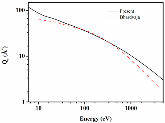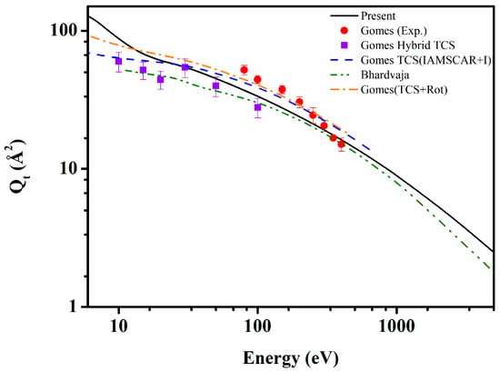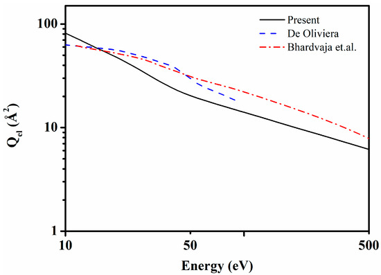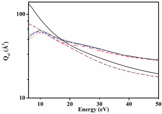 The calculated cross-sections of molecules are represented graphically (Figure 1, Figure 2, Figure 3, Figure 4, Figure 5, Figure 6, Figure 7, Figure 8, Figure 9, Figure 10, Figure 11, Figure 12 and Figure 13). Atomic units were used for calculations with the cross-section values in the units of Å2 on the Y-axis and energy of the projectile in eV on the X-axis (logarithmic scale on both axes). Comparison data for the molecules are plotted in separate figures and, wherever it is not available, calculated data of all isomers of the target molecule are plotted in the same graph.