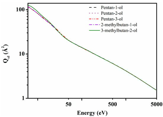 The integral elastic cross-sections of pentan-1-ol reported by de Oliviera et al. [29] have higher values at intermediate energies than calculated elastic cross-sections of Bhardvaja et al. [30] and our results (Figure 3), though the trends appear similar. The effect of the isomeric structure on the elastic cross-section of pentanol isomers, however, appears to be of minor significance in our results (Figure 4) except for 3-methylbutan-2-ol. This deviation from the trend in comparison with butanol isomers needs more investigation, as this secondary amyl alcohol has a methyl group as well as a hydroxyl group attached to the inner carbon atoms.