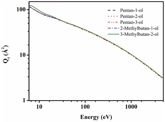 There are no experimental data available for pentan-1-ol to the best of our knowledge, hence, we compared the present results (Figure 12) with static-exchange and static-exchange plus polarization calculations of de Oliviera et al. [29], which are in very good agreement with our results except for energies lower than the ionisation threshold. Since there is no experimental or theoretical data available for Qmtcs of isomers except for pentan-1-ol, a comparison of our results (Figure 13) shows that they are in line with the observations for our elastic and total cross-sections. The isomer effect here again is not significant for the ones other than 3-methylbutan-2-ol, which has values higher in magnitude in low to intermediate energy range as compared to others. The trend shown by all isomers, however, is consistent and along expected lines.