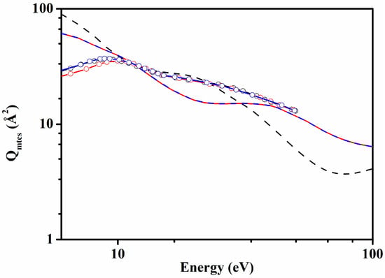 Momentum transfer cross-section for butanol isomers: present results are depicted as lines and results from Bettega et al. are shown as lines with open circles. Butan-2-ol results are shown in black, 2-methylpropan-1-ol in red and 2-methypropan-2-ol results in blue colour.