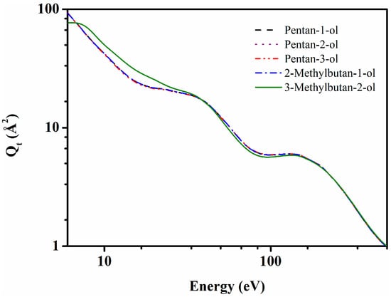 Our calculated TCS of pentan-1-ol (Figure 7) is in very good agreement with the calculated results of Bhardvaja et al. [30], except for very low and very high energies. There are no experimental results available for the same to the best of our knowledge for comparison with our data. Interestingly, the TCS results of pentanol isomers (Figure 8) inherited the same features from their elastic cross-sections and here again, 3-methylbutan-2-ol displays a deviation from the trend observed in butanol isomers.